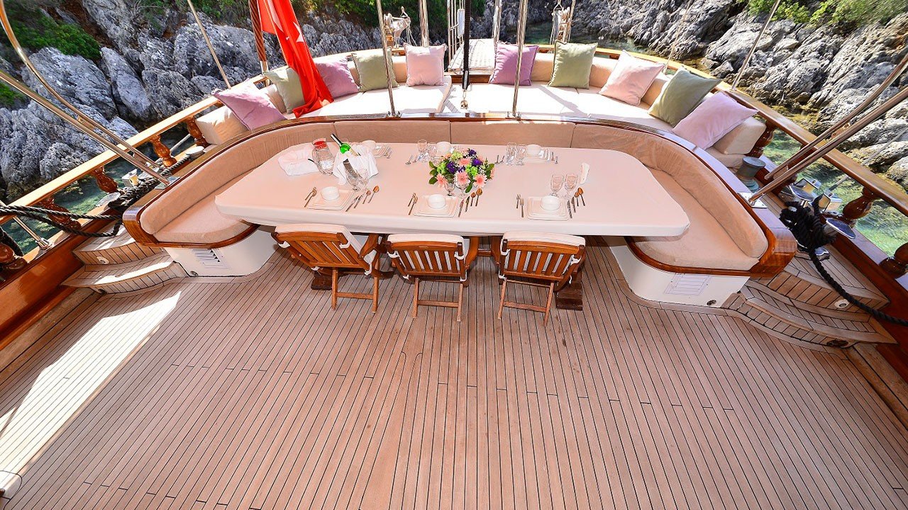 Aft deck offers a spacious lounge and sunbathing area with oversides sunpads and cushions. Alfresco dining area consists of a large table with a sofa and chairs to seat 8 guests.