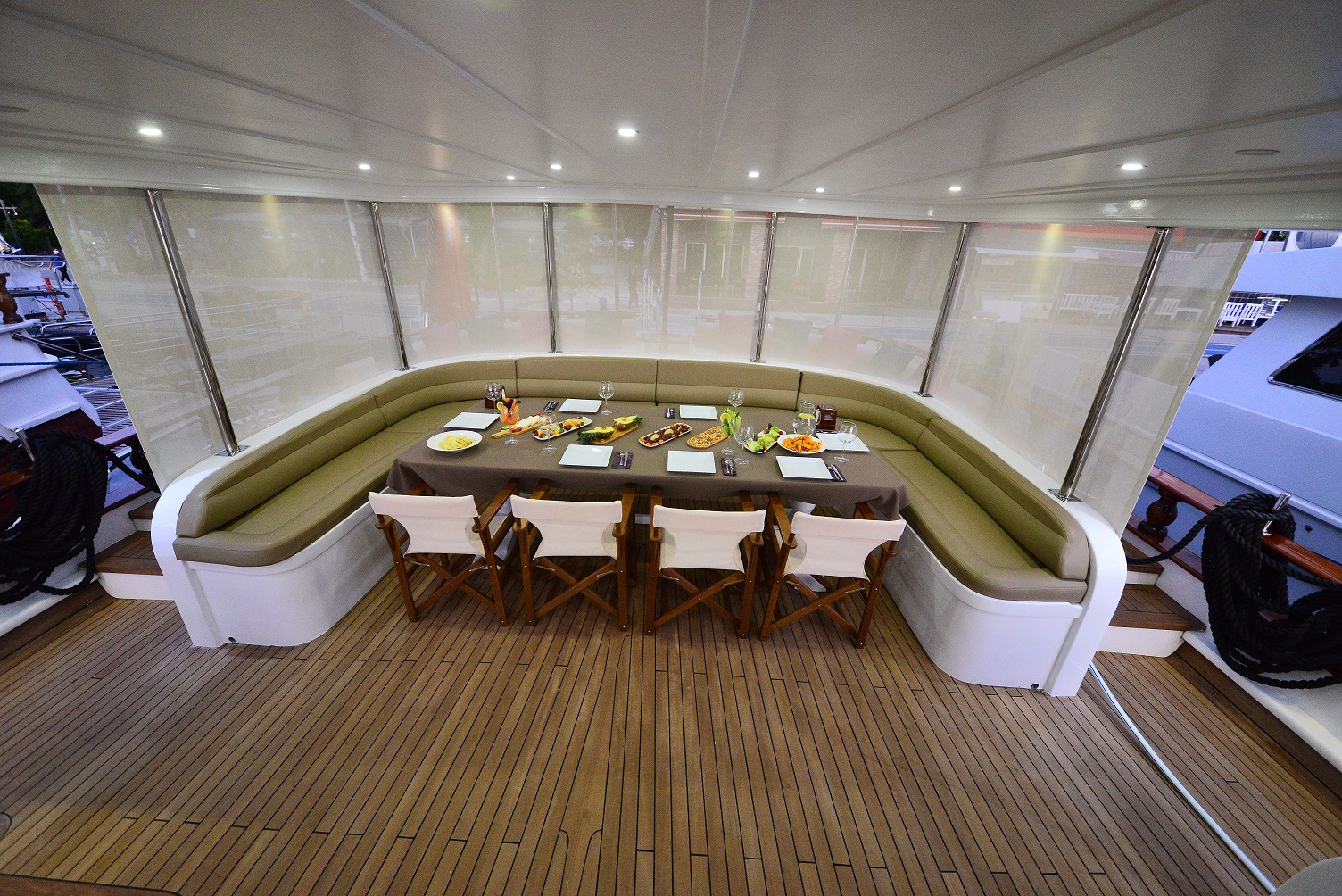 Aft deck offers a spacious lounge and sunbathing area with oversides sunpads and cushions. Alfresco dining area consists of a large table with a sofa and chairs to seat 8 guests.