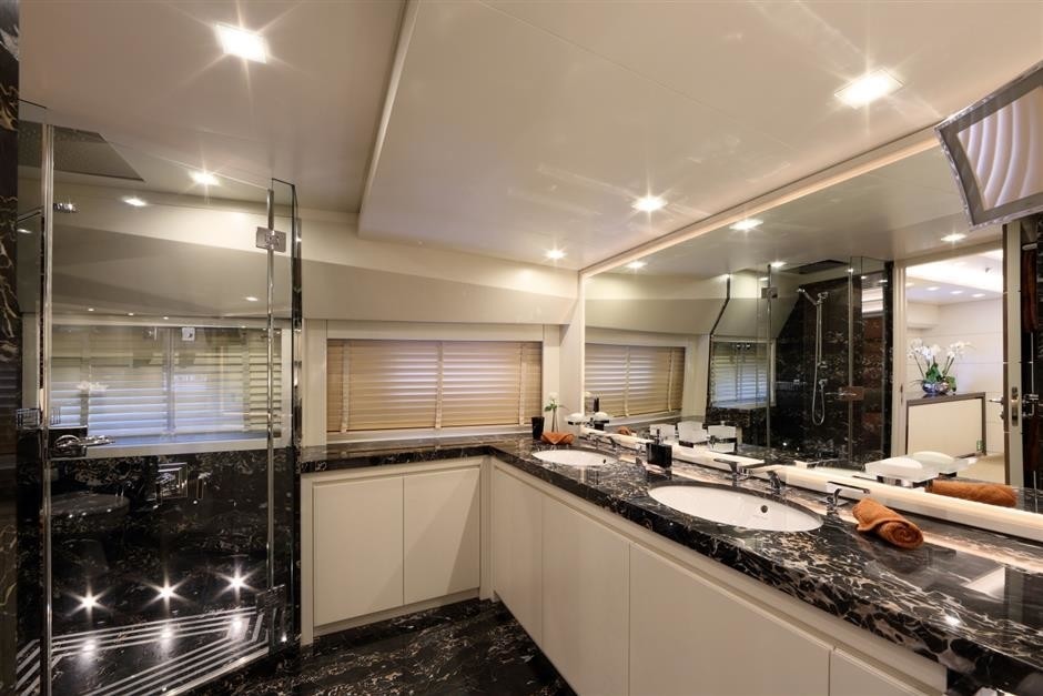 ~ All but the forward single cabin have a wardrobe and wall-mounted widescreen TV.