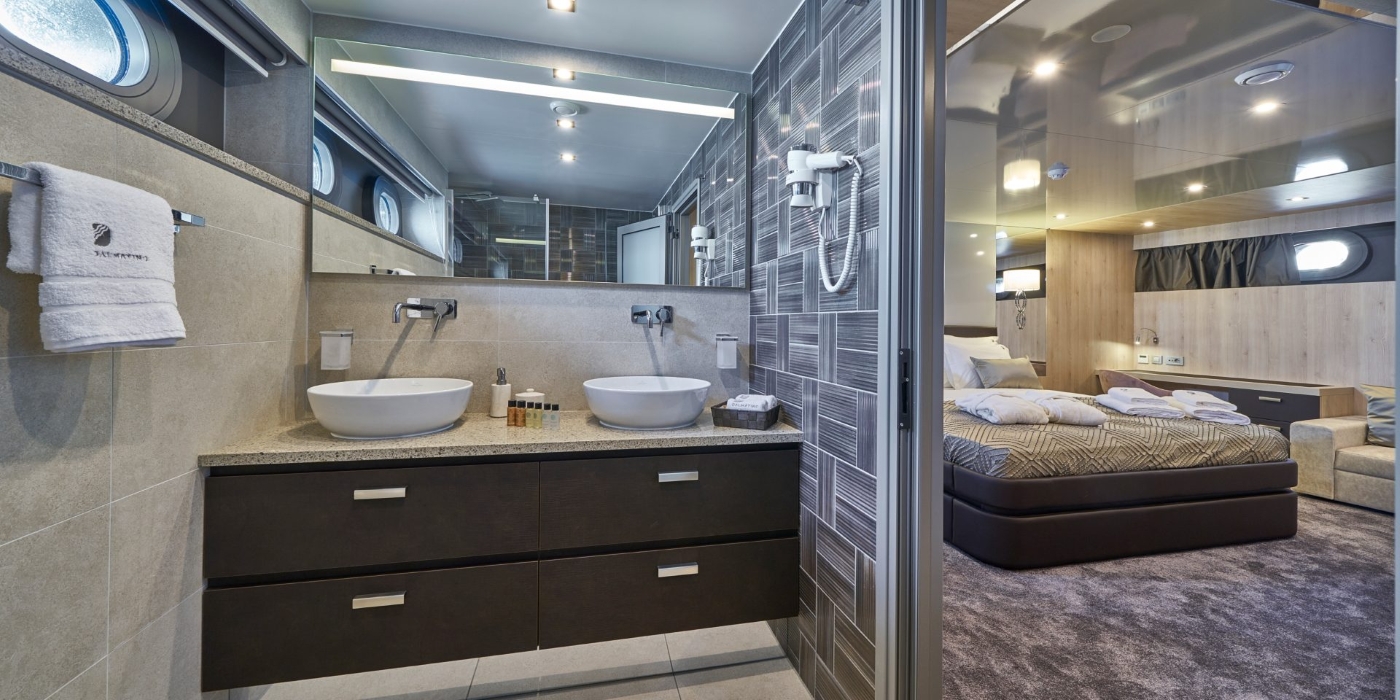 On deck, DALMATINO has a shaded aft area featuring alfresco dining and an aft sun pad, with partial shade, it is the perfect spot to entertain. Her upper deck is capacious, boasting vast teak decking, seating, sun pads, and deluxe jacuzzi.