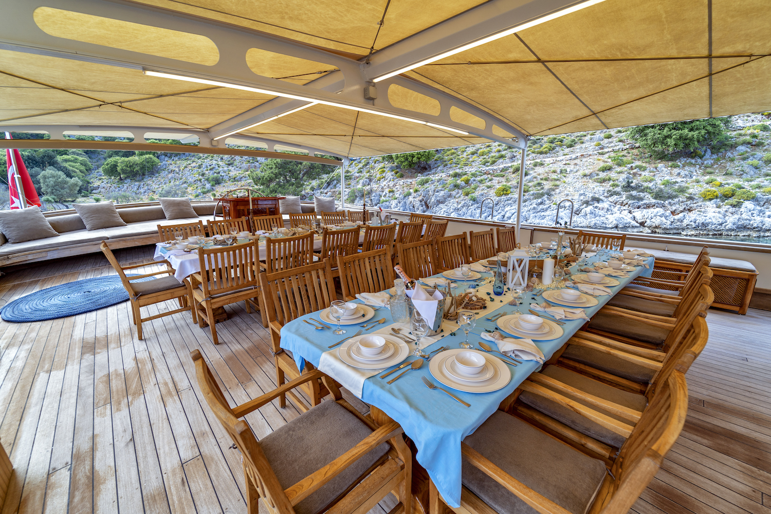 On deck, TERSANE 8 has something for everyone, with alfresco dining on the aft deck under the shade of a Bimini, a full beam stern sun pad, while forward there is a further alfresco dining table, making the space functional for any occasion. Sun pads are located on the upper deck, perfectly placed to enjoy the East Mediterranean sunshine.