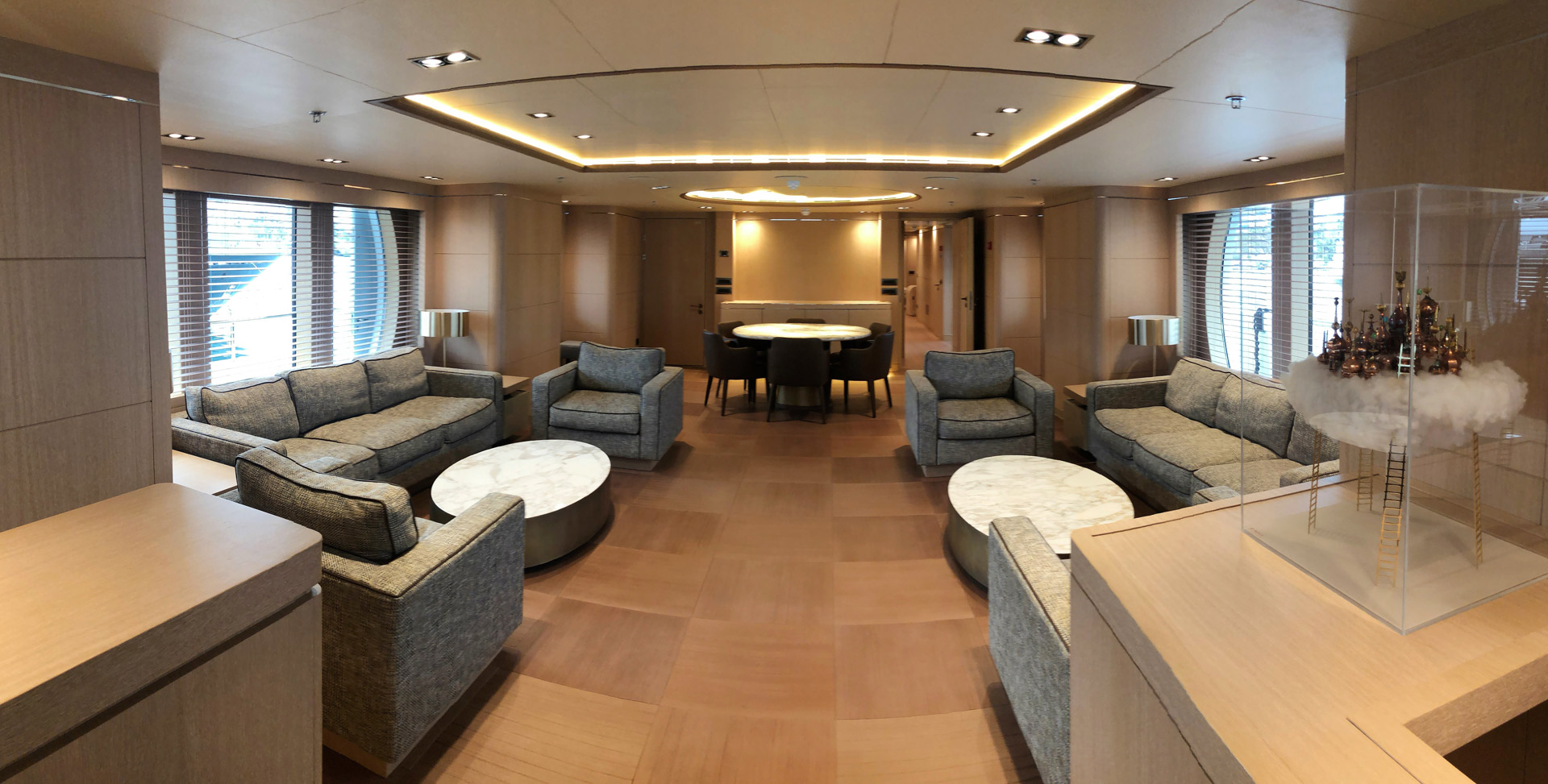 Up, on the main deck aft, the upper deck overhang creates a shaded environment for outdoor lounging and alfresco meals on the sofa at the raised dining table.