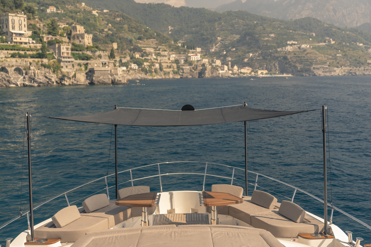 Here, guests can settle into the sofa along the stern and enjoy and alfresco meal at the elevated table before sunbathing on the foredeck sunbed, or settling in along the bow for conversation, refreshments and uninterrupted ...