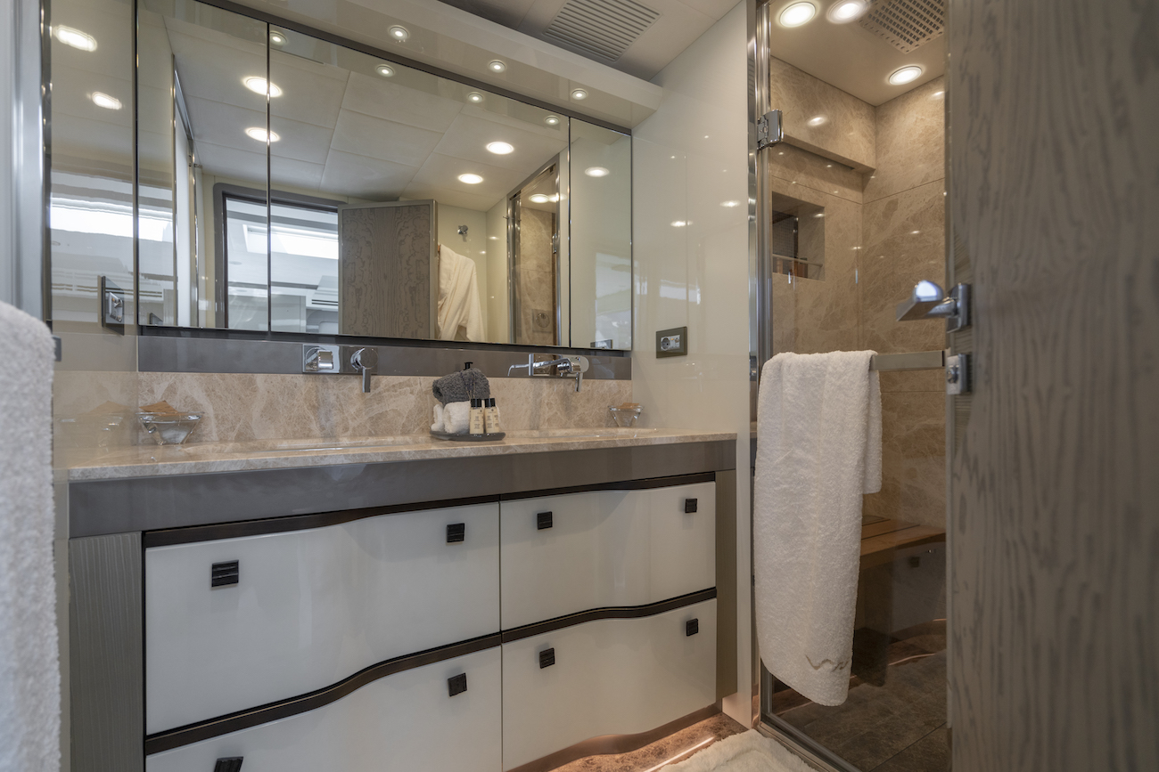 Aft of the main deck foyer there is a large open-plan room where the formal dining area is situated forward and glass sliding doors on either side lead to fold-down balconies. Behind, the lounge provides plush oversized seating ...
