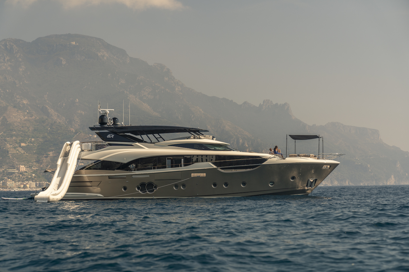 With modern interiors by Nuvolari Lenard, the yacht can accommodate up to twelve guests over a five-cabin layout with a crew of four on board.
