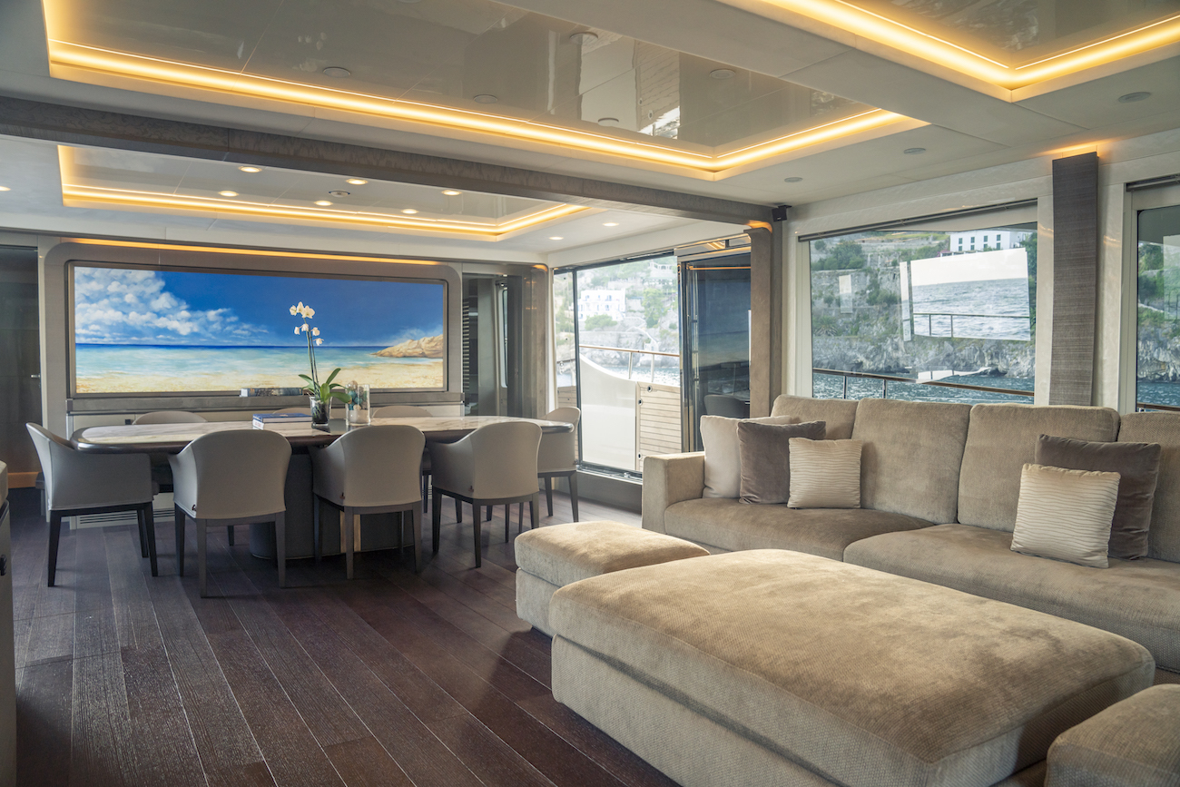 With modern interiors by Nuvolari Lenard, the yacht can accommodate up to twelve guests over a five-cabin layout with a crew of four on board.