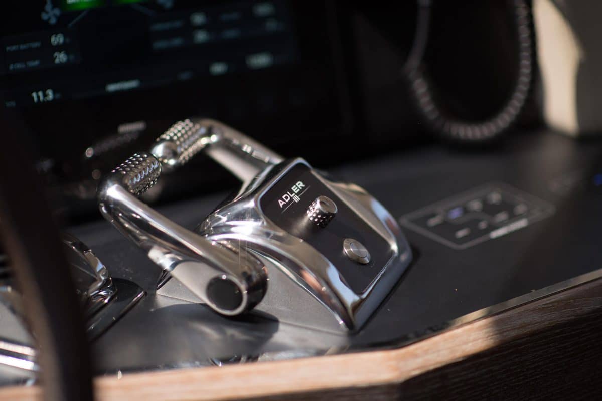 On the main deck, the helm controls are placed forward and are separated from the salon by the port-side galley and a set of steps leading to the aft lower level. A wet bar is placed forward to starboard with a corner sofa and coffee table for comfortable gatherings between family and friends.