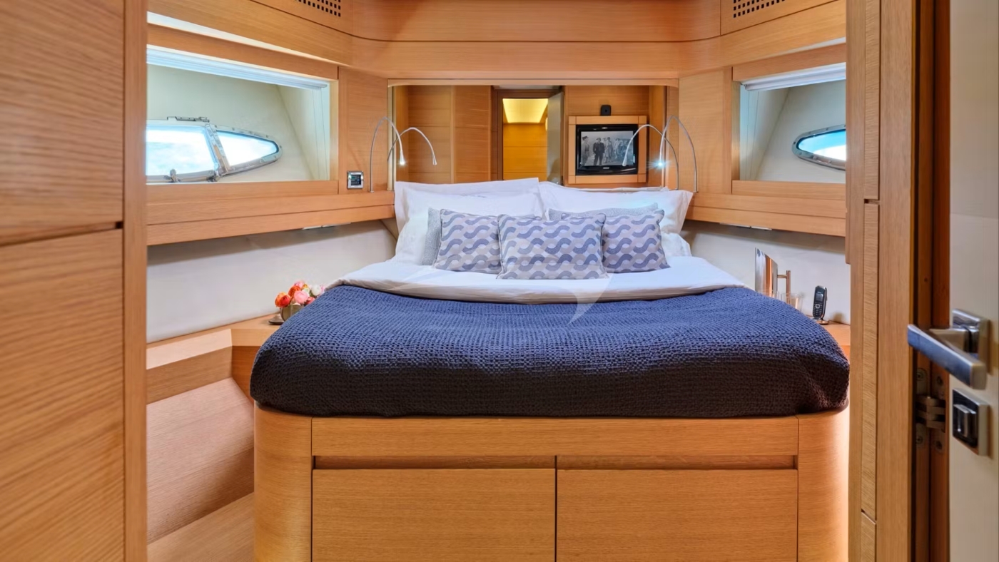 A corner sofa is placed to starboard with another aft-facing sofa creating a social space around a coffee table.