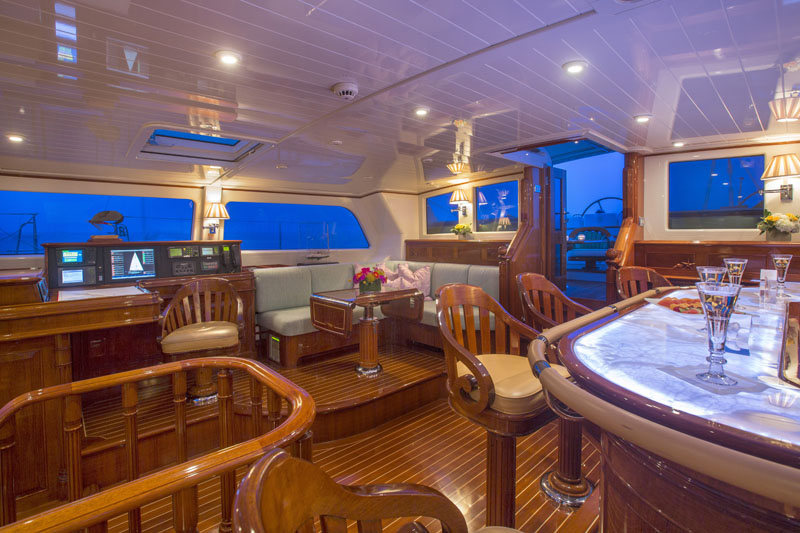 She has excellent views from her well designed raised pilot house/bar area. Her generous cockpit, which can seat up to 10 guests, is another well designed space for dining with its bimini sun shade. There is also a full width salon with dining area.