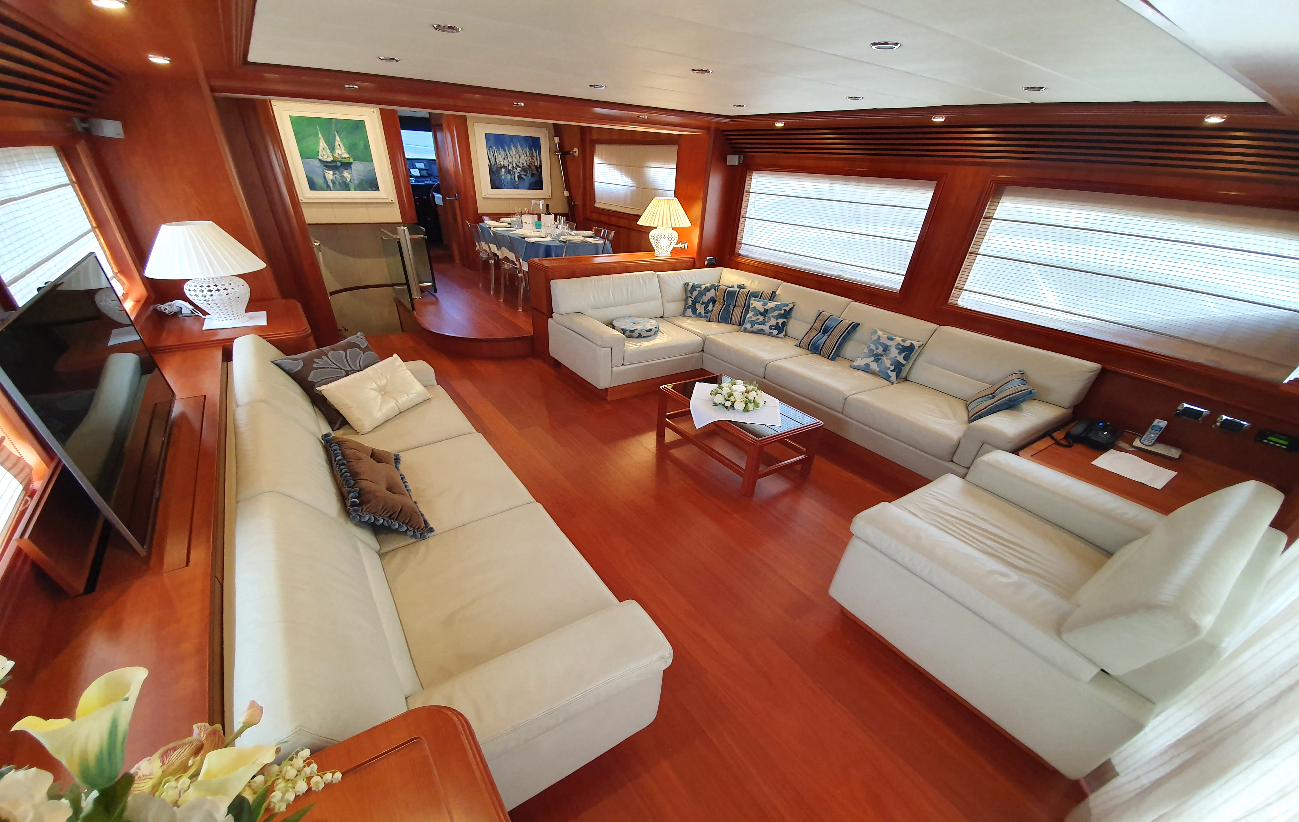 The open-plan salon places a glass formal dining table and eight chairs forward, aft of which is a leather sofa to port and a second larger seating area with a sofa, armchair and coffee table for an inviting conversation space.
