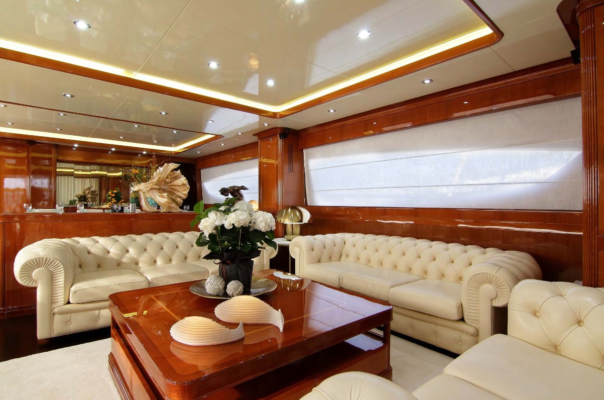 The Master suite on the main deck forward is furnished with a king-sized bed, a desk and two large wardrobes, side tables, a widescreen TV hidden in the forward cabinetry and an aft en-suite bathroom that has a toilet, sink, shower and a bathtub.