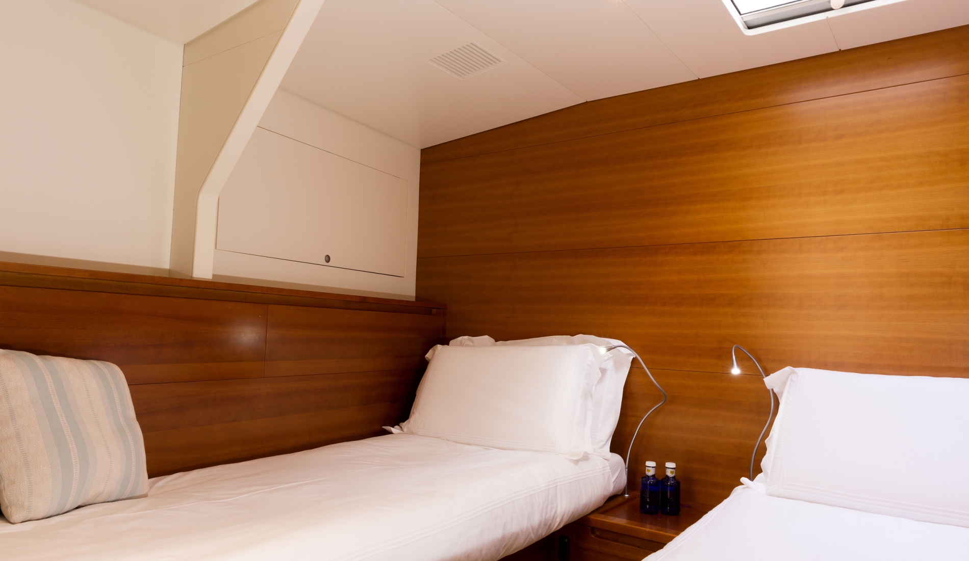 She is a powerful performance sloop that sleeps up to 8 guests over three modern cabins, with luxury amenities. There is also accommodation for a crew of 4 on board.