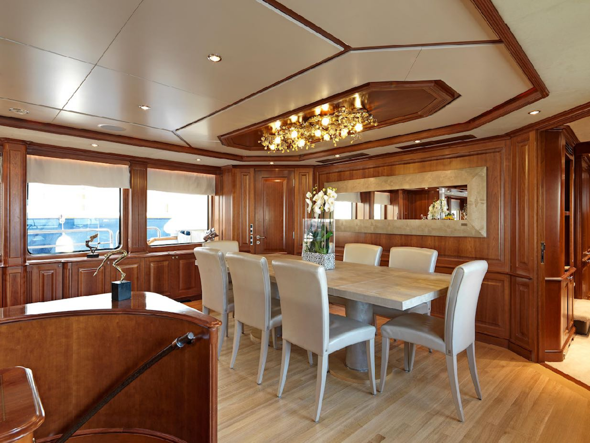 After a morning in the water, guests can rest and take a meal on the main deck aft, where a raised alfresco dining table is surrounded by a C-shaped sofa along the stern and additional movable chairs.