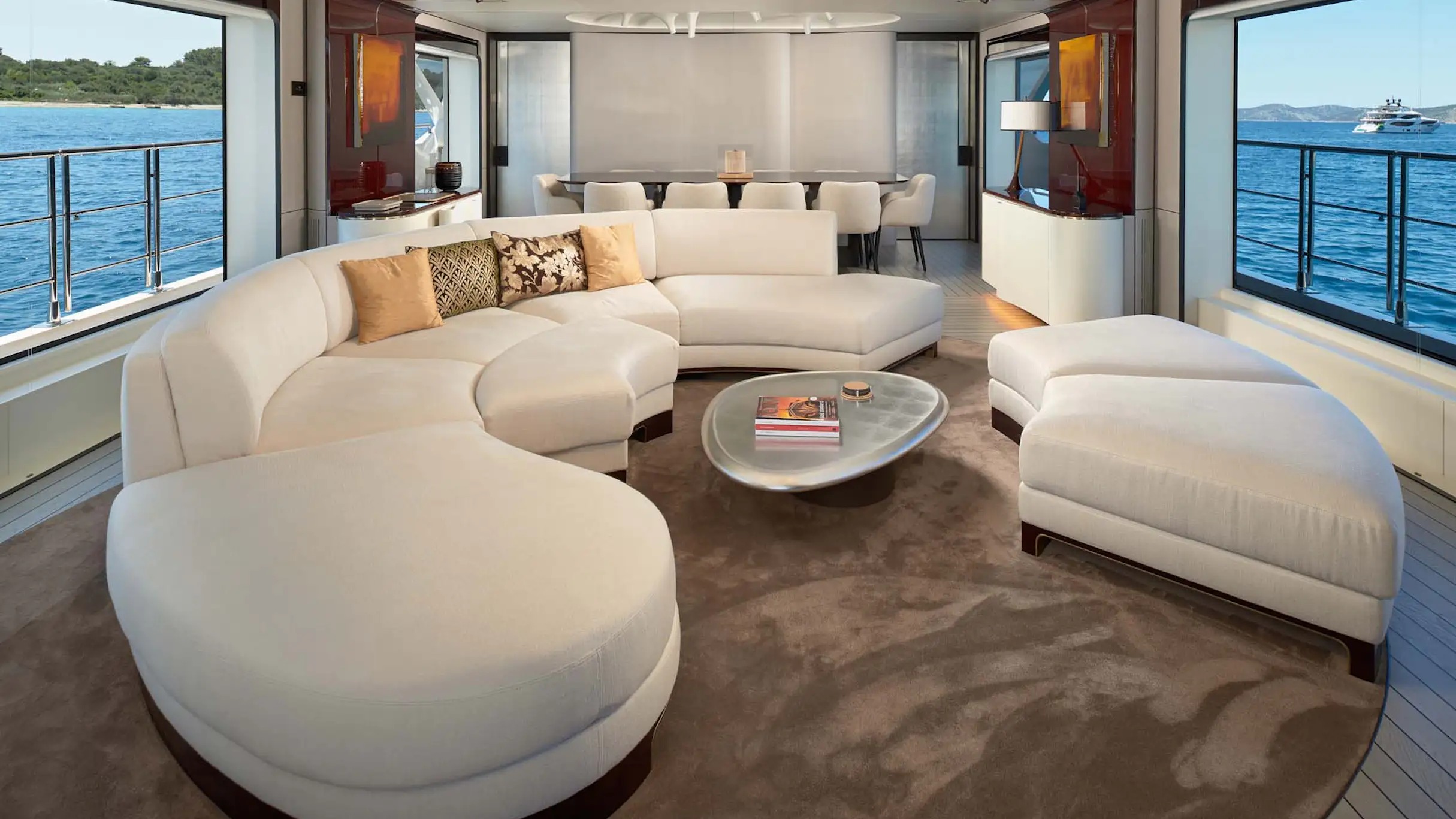 A swim ladder to starboard provides easy access into and out of the water, and two stairways lead up to the main deck aft, where there is a C-shaped sofa along the stern, two fold-out tables for alfresco dining and unwinding with ...