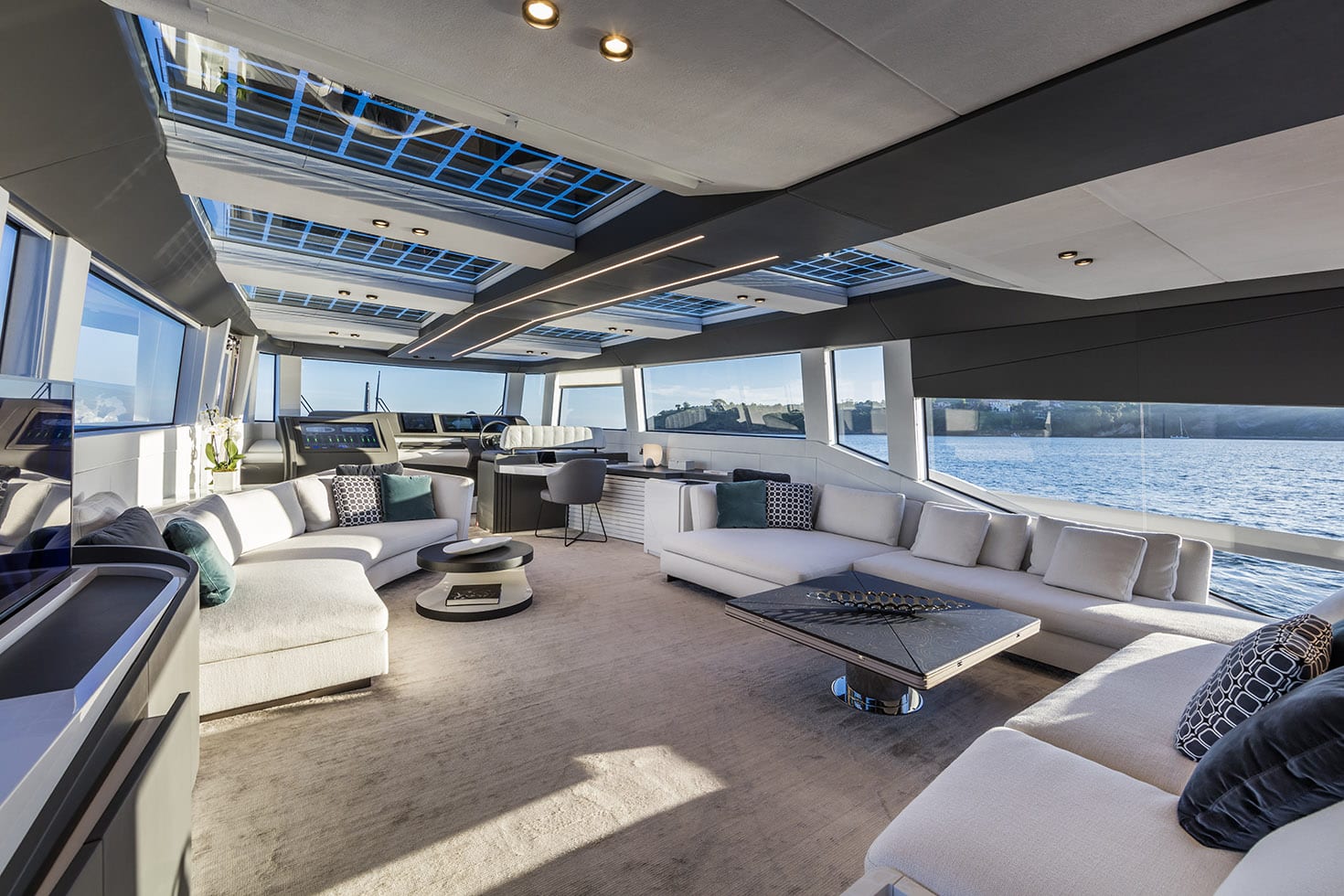 Inside, the aft bathroom has two sinks, a toilet, bidet and a shower.
