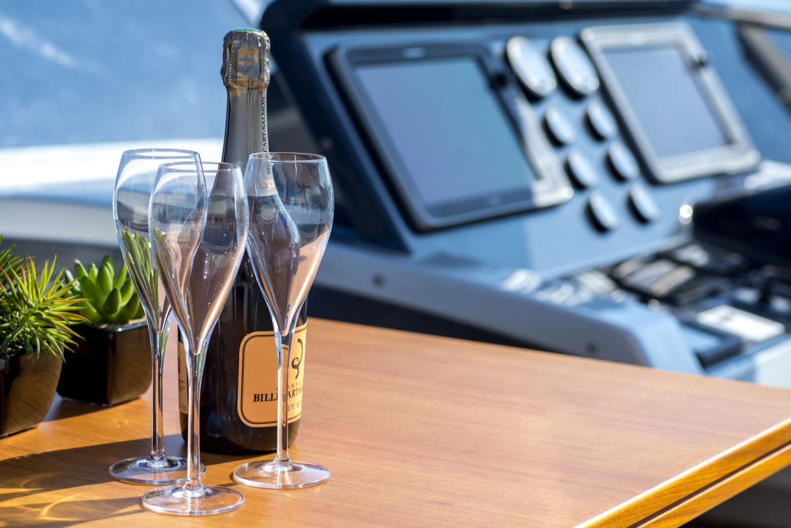 The yacht measures 25.20m (82' 8") and features interior design by Salvagni Architetti, accommodating 9 guests over 4 luxurious cabins, while a crew of 3 offers exceptional service on board.