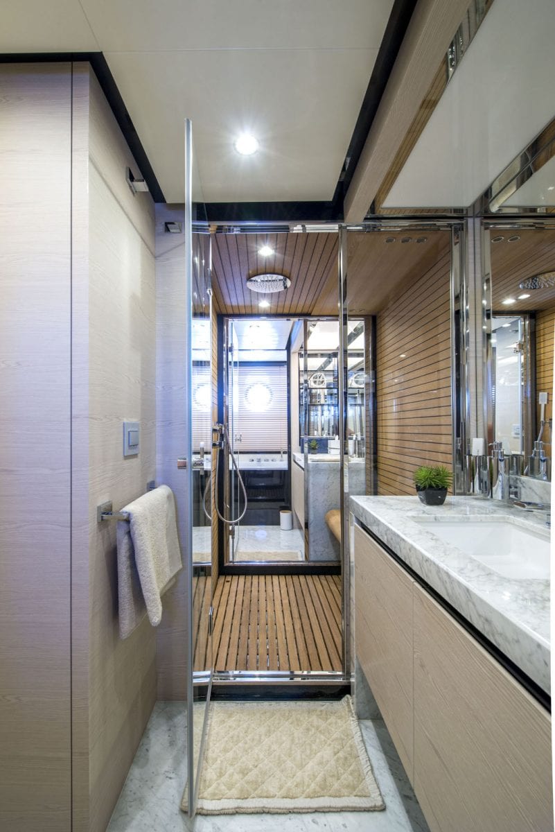 The aft en-suite bathroom has two entrances, the port one leading to the toilet, bidet and sink, the starboard entrance leading to the bathtub and sink, with a shower in the centre.