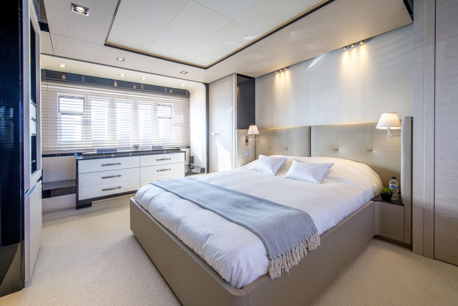 The yacht measures 25.20m (82' 8") and features interior design by Salvagni Architetti, accommodating 9 guests over 4 luxurious cabins, while a crew of 3 offers exceptional service on board.
