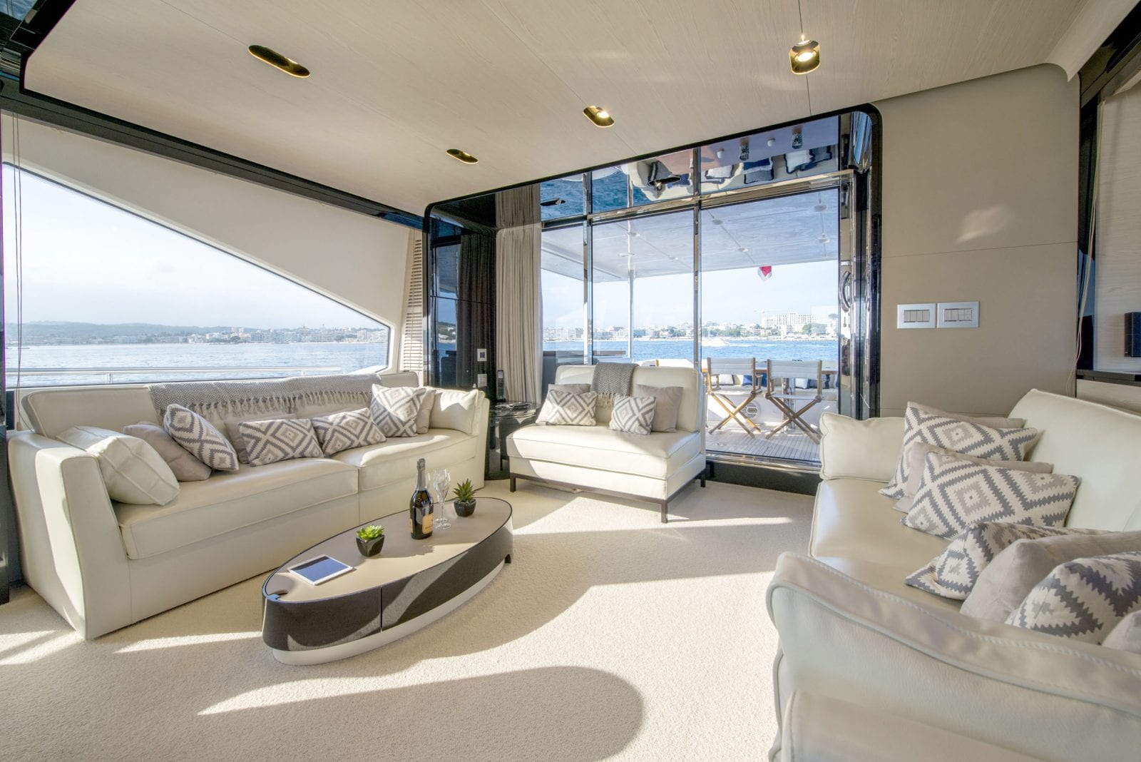 In the forward space in the sunshine, the flybridge controls are placed to starboard and a C-shaped sofa with drinks table fits in the opposite corner.