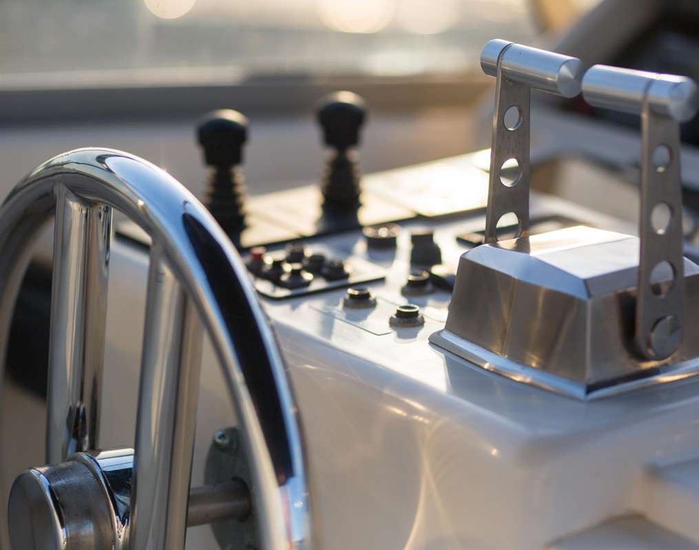 A canvas shade covers the area for all-day outdoor usage, and forward in the sunshine there is seating in front of the helm controls with an additional pilot's chair adjacent.