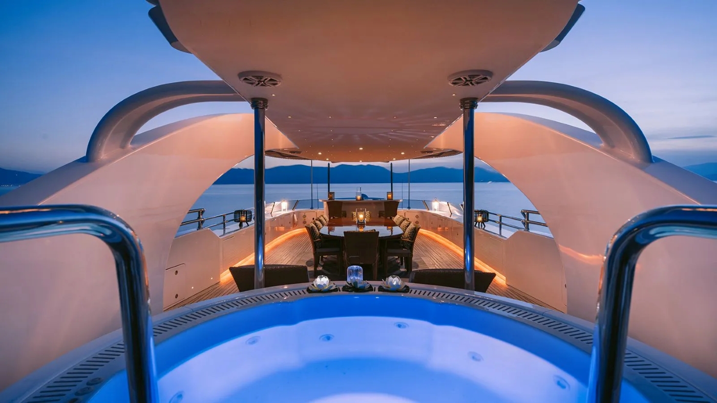 In the main salon, an ample lounge with plush seating and coffee table is ideal for socializing, while forward, the open plan formal dining allows guests to dine is style. The upper sky lounge boasts comfortable sofas, coffee table and full entertainment systems.