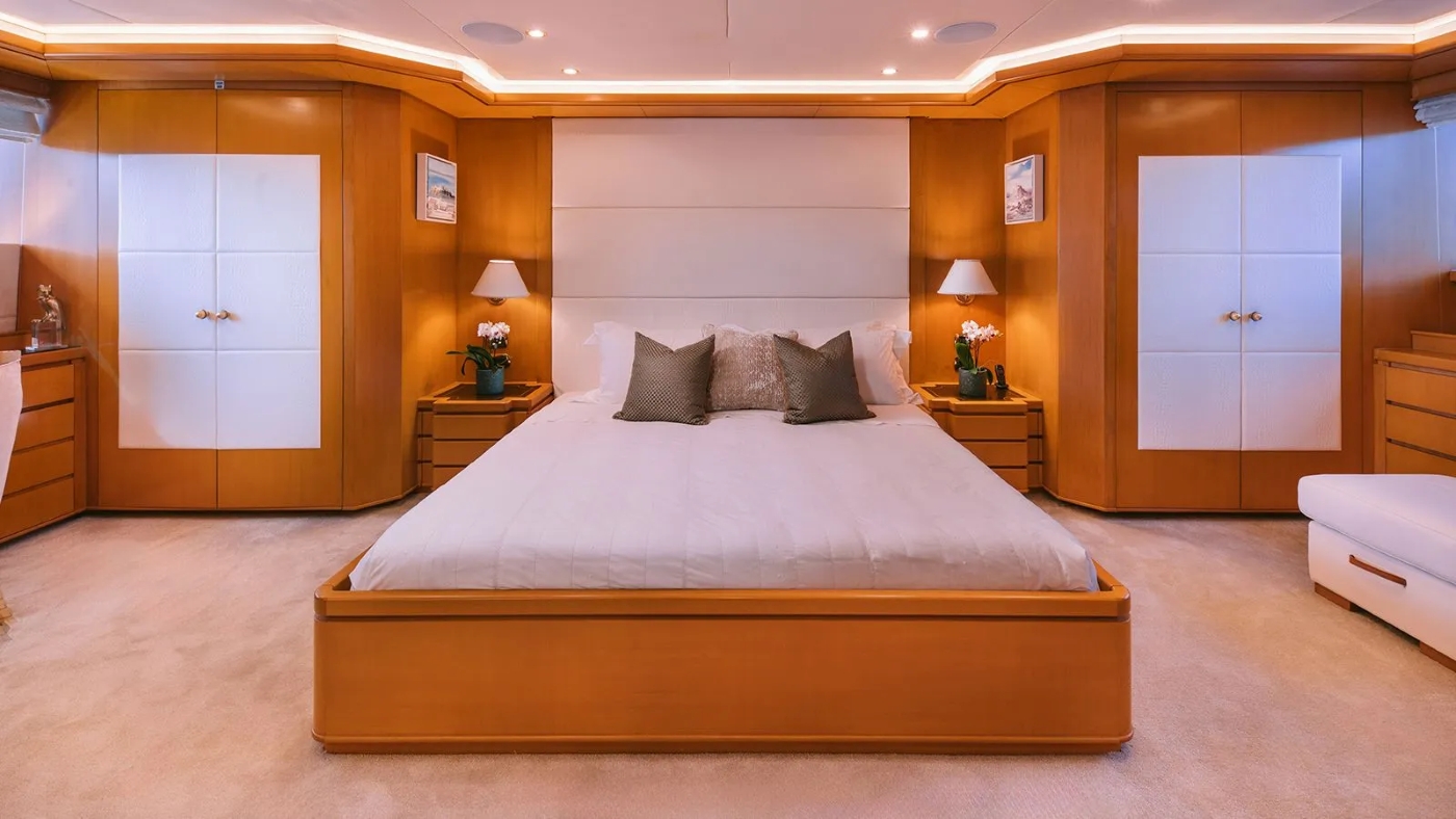 In the main salon, an ample lounge with plush seating and coffee table is ideal for socializing, while forward, the open plan formal dining allows guests to dine is style. The upper sky lounge boasts comfortable sofas, coffee table and full entertainment systems.