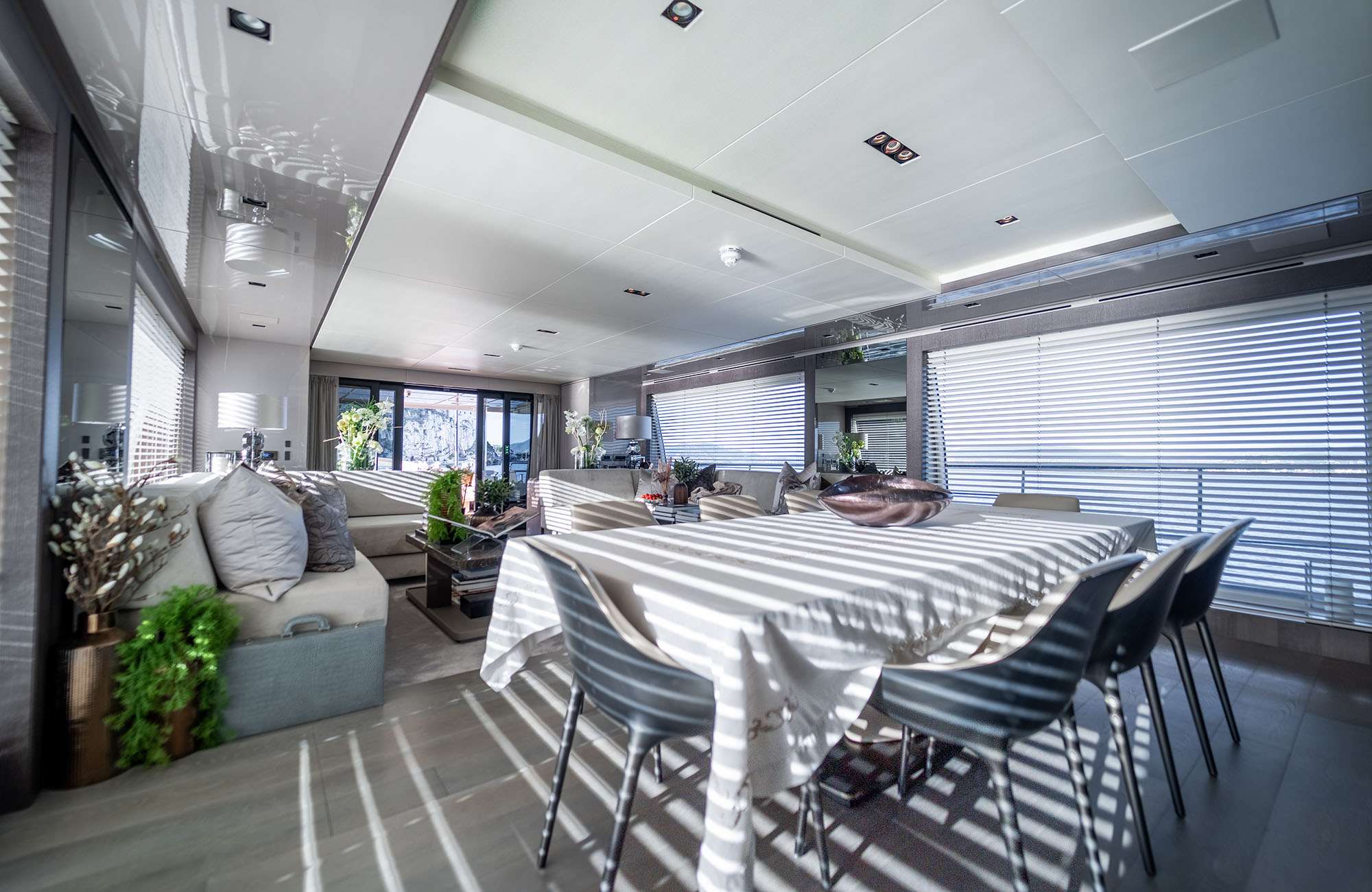The flybridge features sun loungers aft and alfresco dining area with a bar central. The hardtop has a retractable roof to enjoy stargazing or relax in shade. Forward, there is additional seating close to the helm station as well as a sunpad for catching the sun rays.