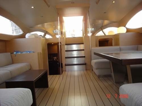 Her hull construction is composite (GPR, Kevlar, PVC) and her light colour interiors in male-oak and wengè wood.