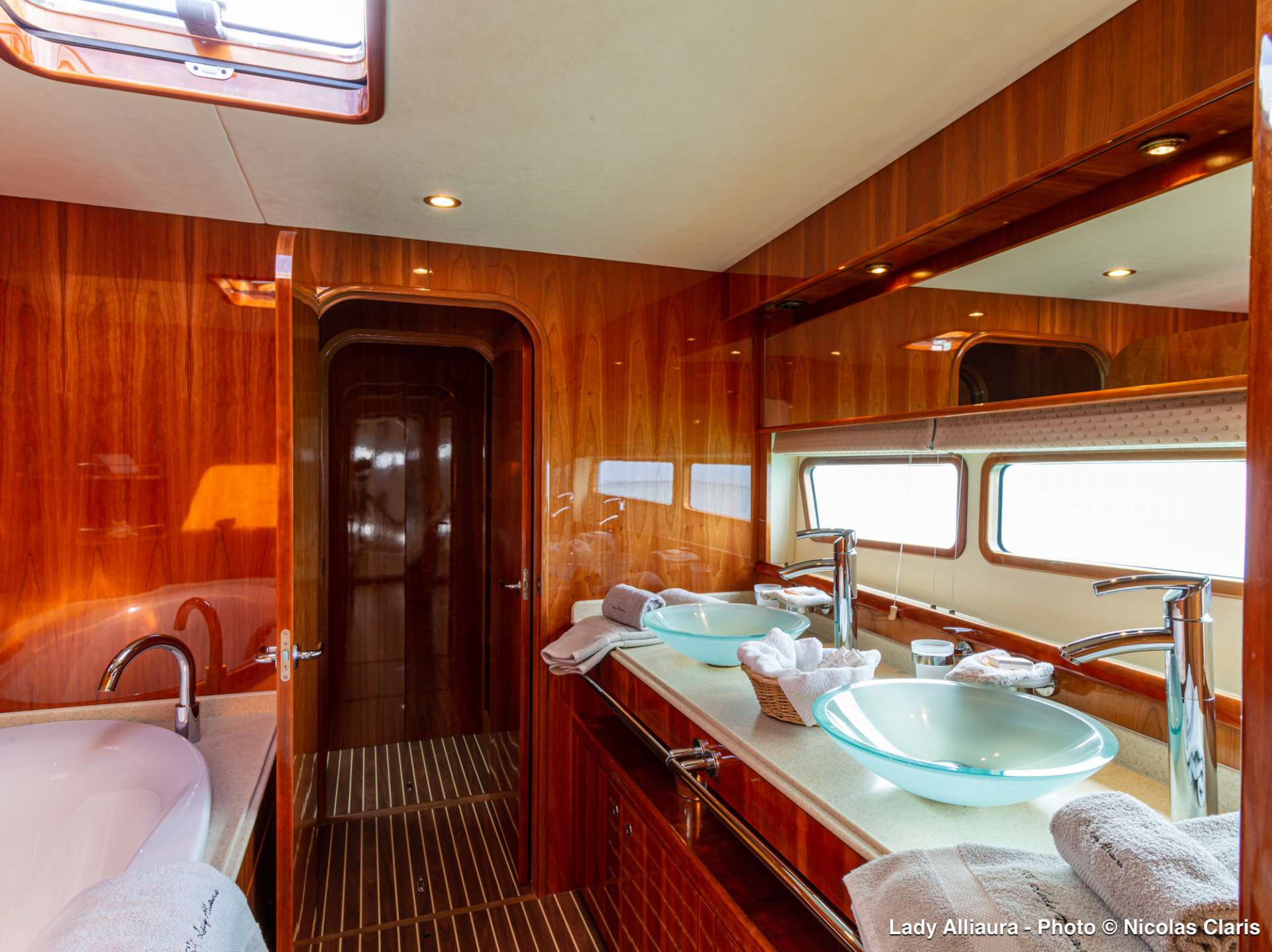 A double sunbed is placed on both sides, and walkways lead around to the foredeck where there are trampolines on the bow for sunbathing and exercise in the sunshine.