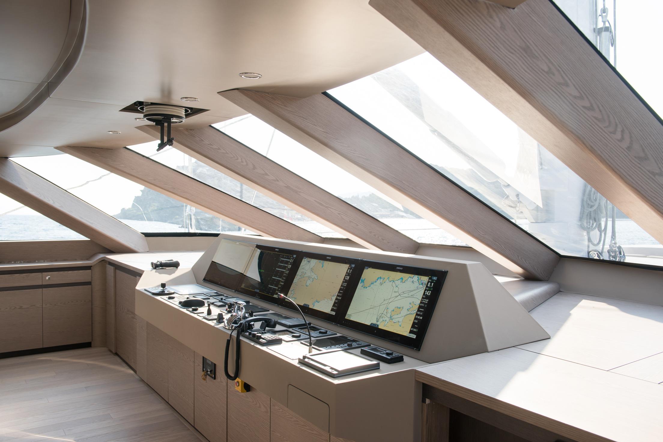 Contemporary interior styling features tones of grey, orange and brown. The main salon features large windows which allow plenty of natural light. Forward of the salon is the formal dining area for 12 guests.