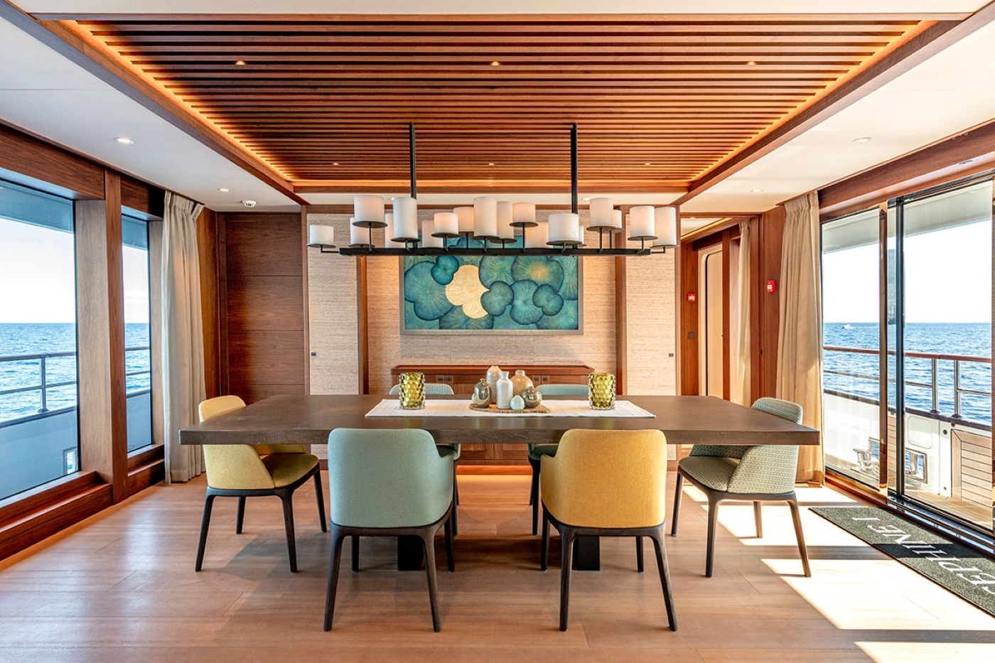 Two stairways lead up to the main deck aft, which is shaded by the upper deck overhang to provide a space for all-day outdoor usage, including alfresco dining.