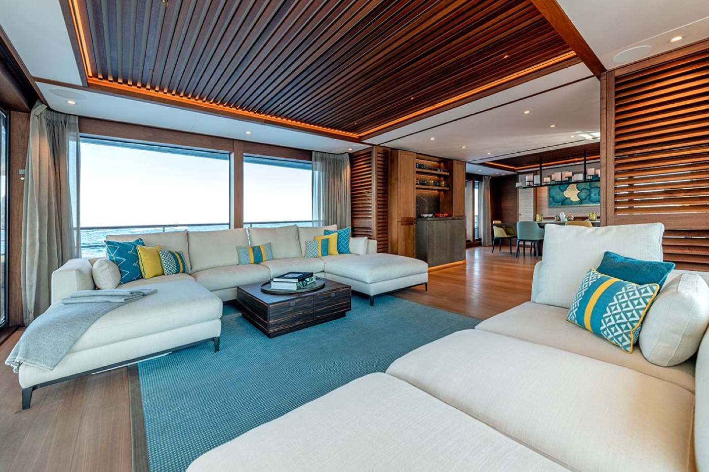 The bridge deck layout places a large Jacuzzi with a swim-up bar and a broad sunbed along the aft for the group to unwind together in the sunshine.