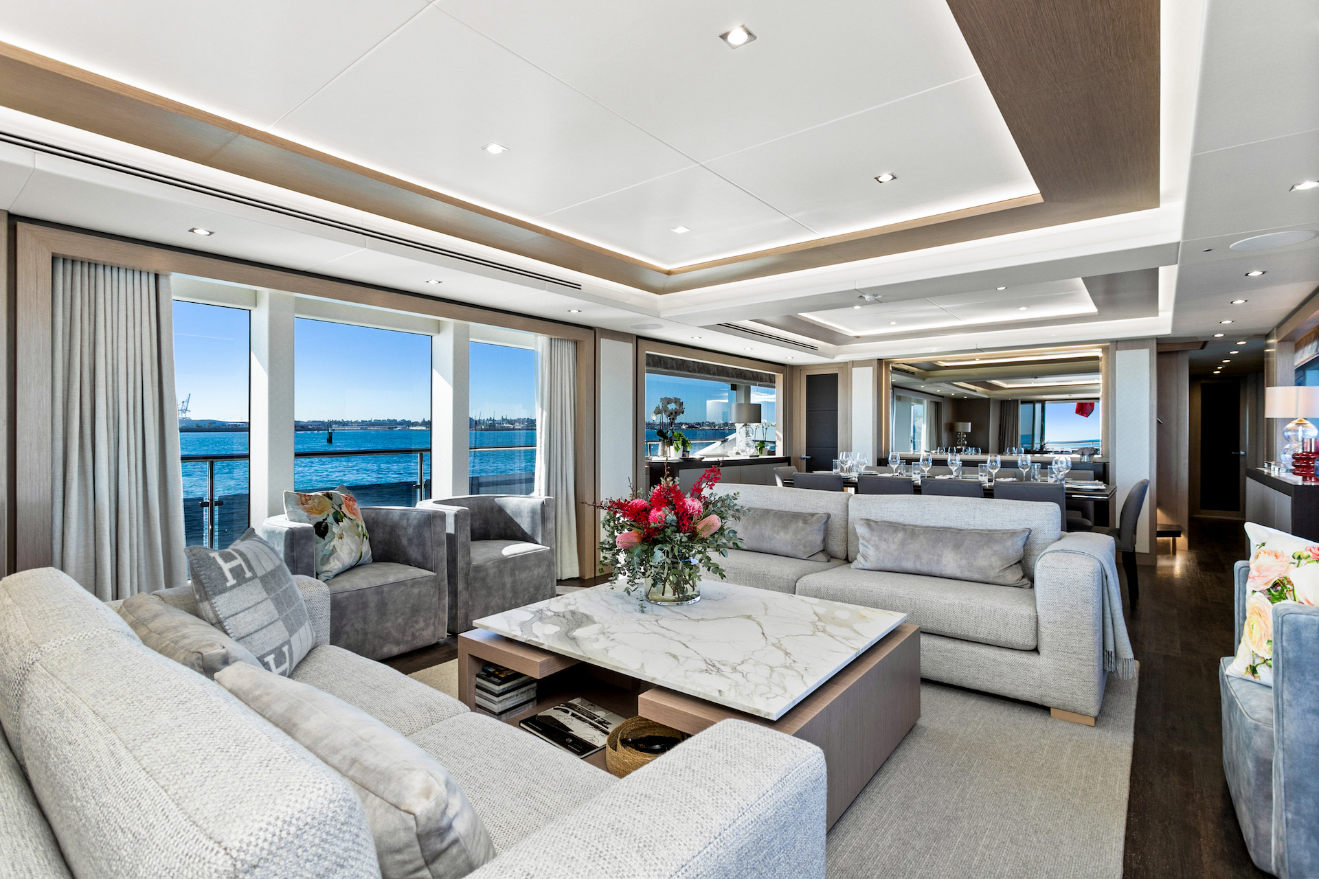 The salon is a welcoming social area with a coffee table between the forward and aft sofa and a pair of armchairs on both sides.
