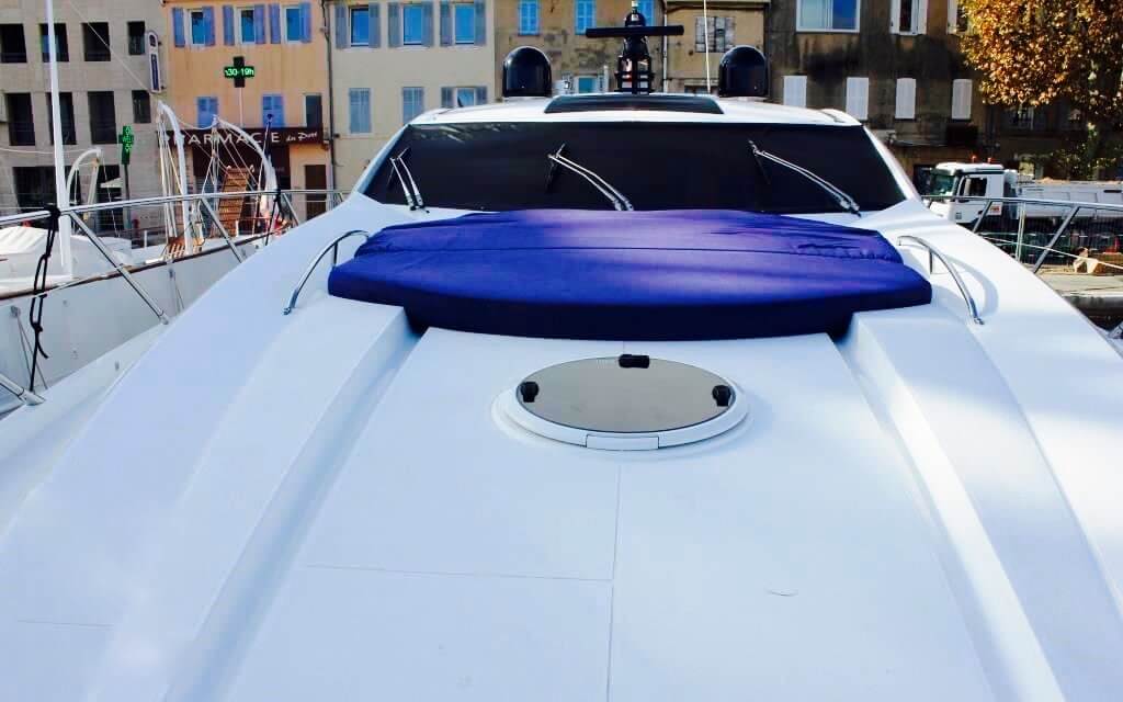 The foredeck is fitted with a broad sunbed where guests enjoy commanding views of the surroundings.