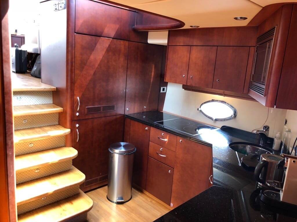 The lower deck hosts the guest and crew accommodation with the galley connecting up to the salon.