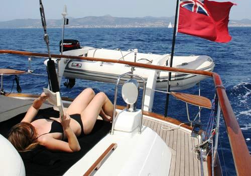 Her deck Barbeque is perfect for lunch or dinner! The yacht also offers glorious teak decks with integral deck cushions forward and aft for you to choose the best sunbathing spot. Teak seats at the bow and stern are perfect for surveying the scenery and spotting sea life.