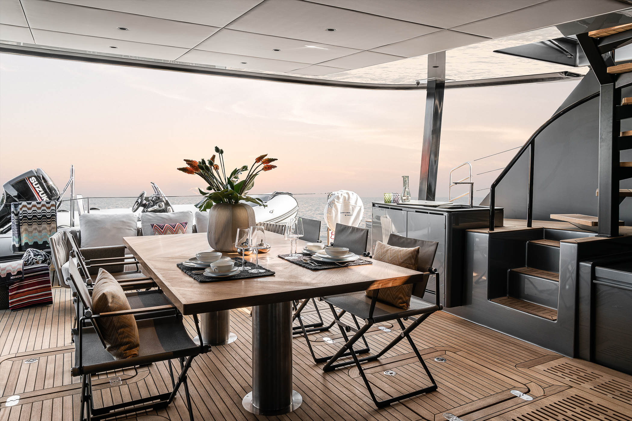 NOTABLE FEATURES OF E: ~Silent 'zero emissions' mode can be used day or night ~Top grade materials used throughout ~Abundance of sunbathing spaces ~Innovative technology ~Impressive selection of modern water toys ~Shallow draft ...