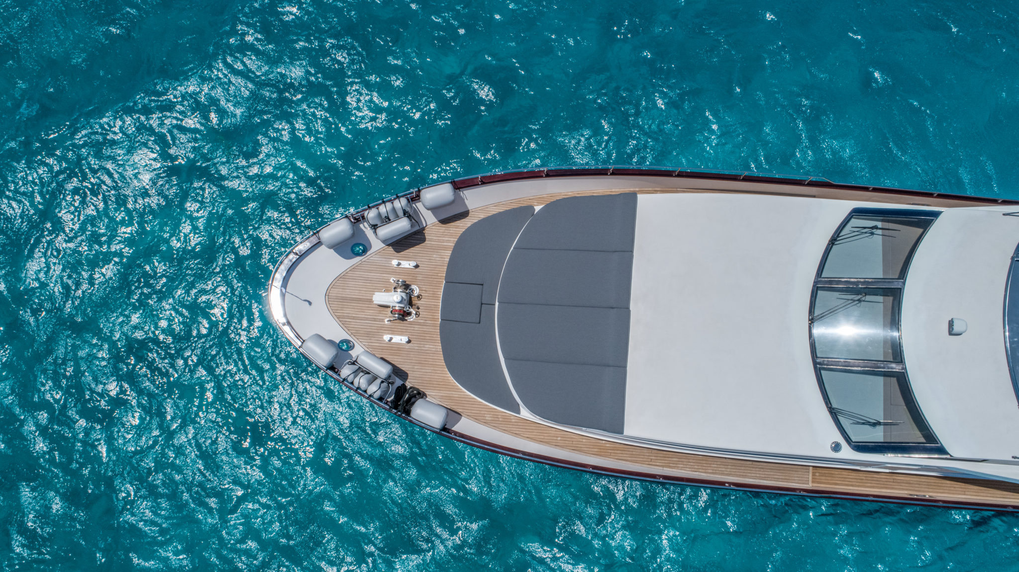 On deck, charter guests can dine alfresco on the shaded aft area, which also leads to the swim platform on the transom, where there is a good assortment of water toys to enjoy. The upper level offers vast seating, sunning, a deluxe jacuzzi and optional shade from a Bimini cover.