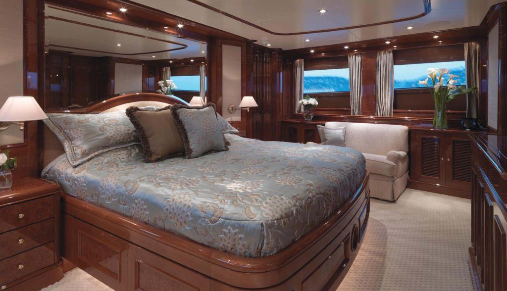 The Master cabin is located forward on the main deck and has a king size bed, sofa and a walk through dressing area with a full length wardrobes. There is additionally a full width en suite bathroom with his and her sides, a bath and walk in shower.