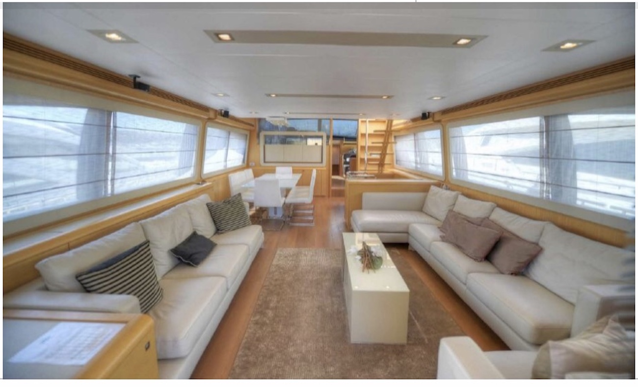The lounge to the aft places a sofa beneath the windows on both sides of the room, with the starboard sofa also having a coffee table.
