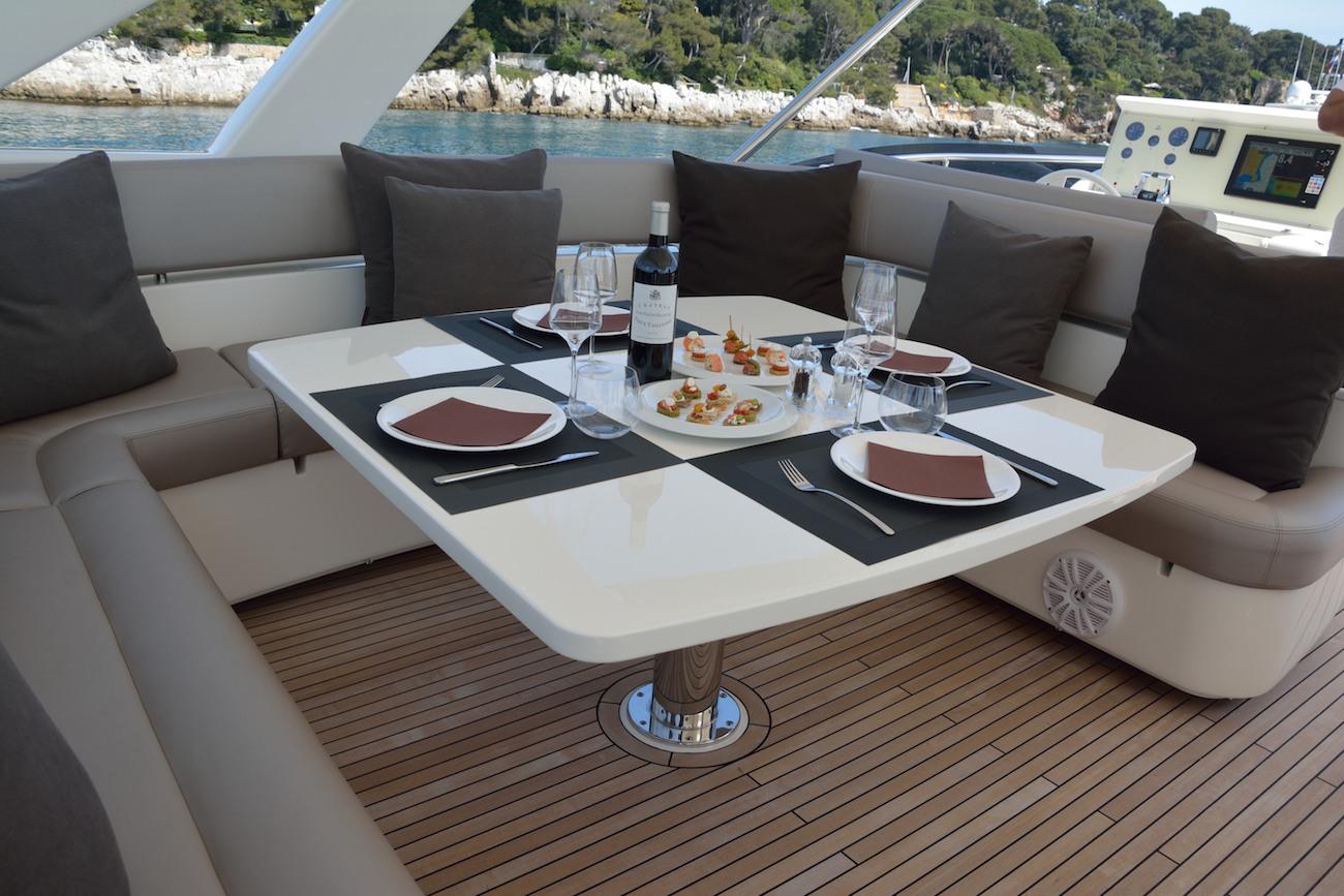 The main deck aft has a spacious sofa/sunbed with a raised table for alfresco dining in ...