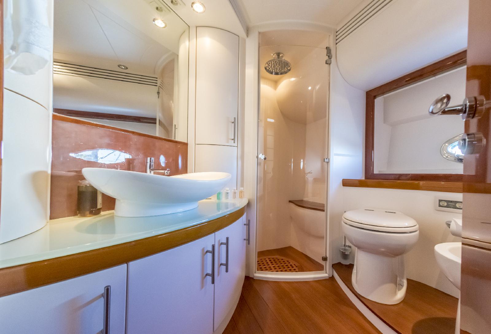 The Master suite is placed amidships to benefit from the full beam and the spacious environment within contains a queen-sized bed placed diagonally with an L-shaped sofa following the opposite wall and a widescreen TV adjacent to the bed and an en-suite bathroom.