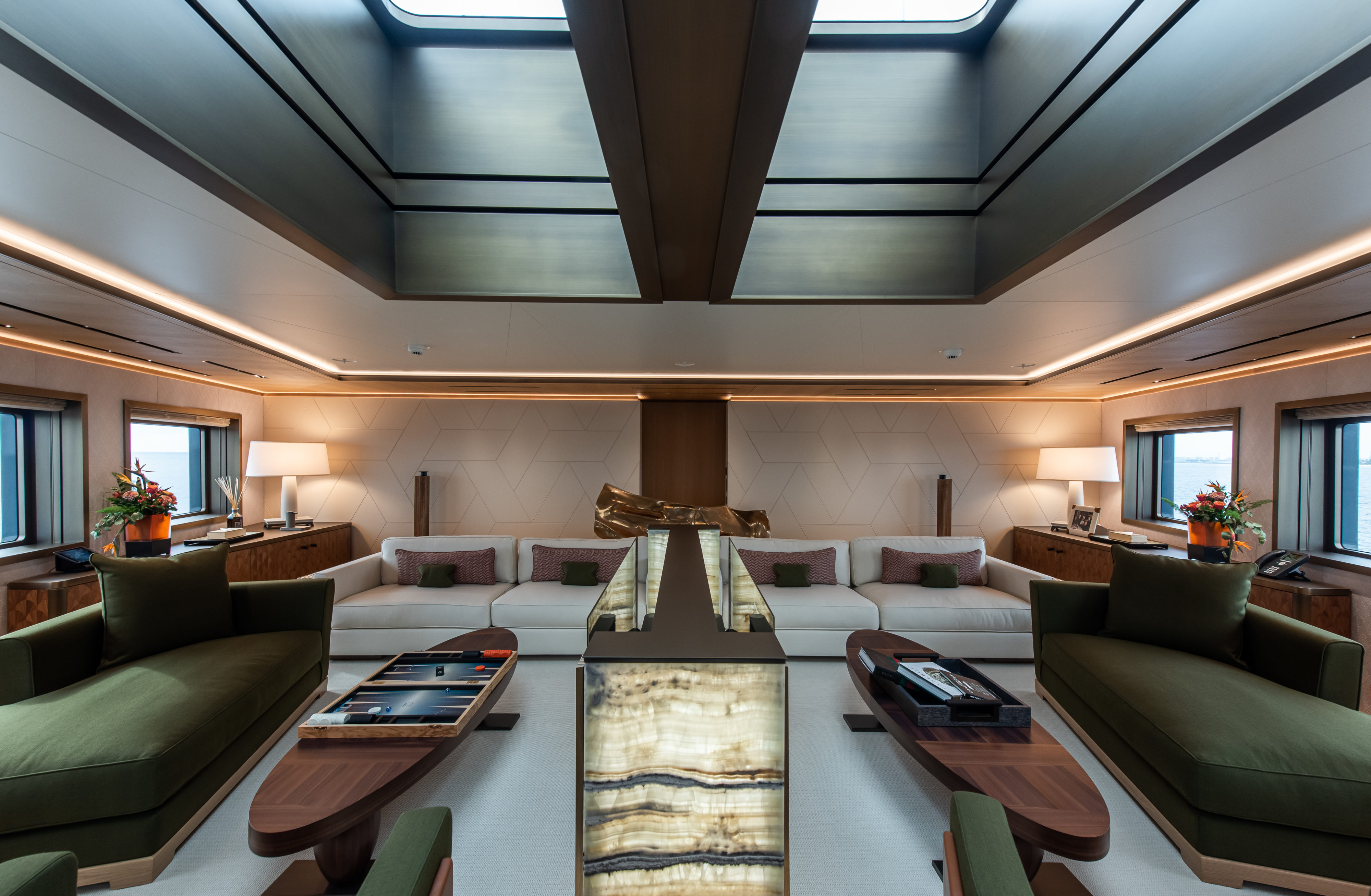 Back-lit panels enhance the ambience of the lounges after dark, and the broad 14m/45.11ft beam provides plenty of room for large gatherings.