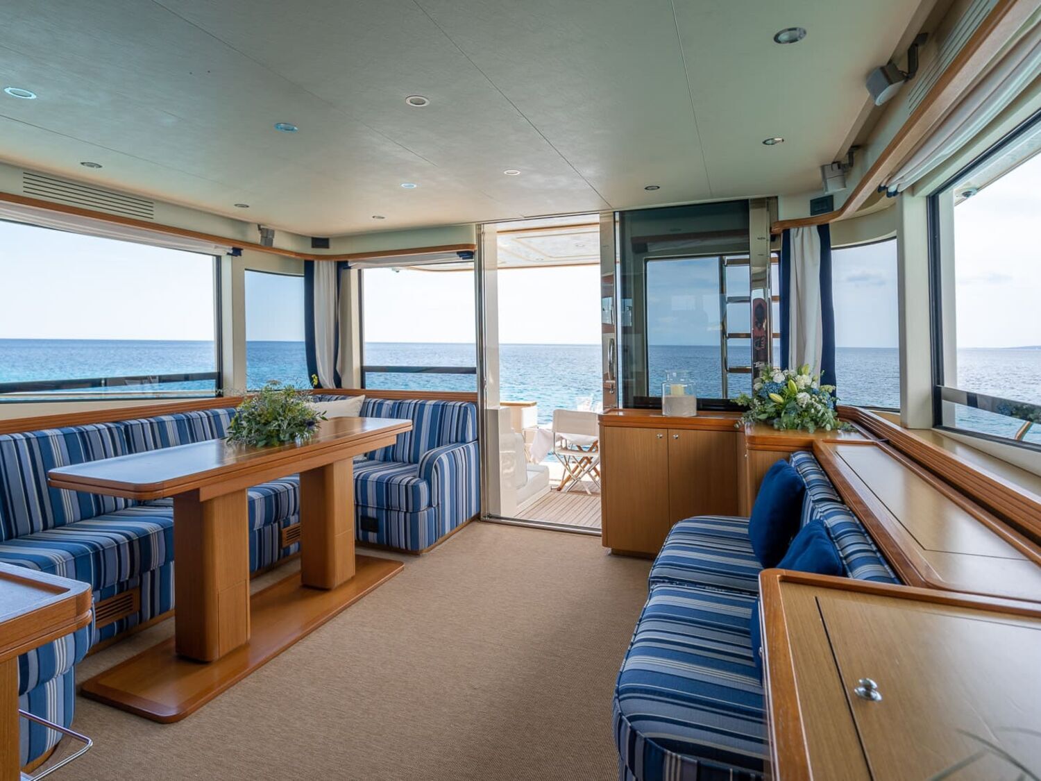 On the main deck, the helm station is placed forward to starboard followed by the formal dining area to seat eight and behind a large ...