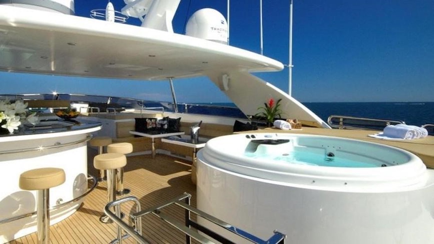 NOTABLE FEATURES OF TRIPLE 888 EIGHT: ~Flybridge Jacuzzi and bar ~Plenty of sunbathing space ~Choice of alfresco dining areas ~Timeless interiors ~Great selection of water toys ~Navigates shallow waterways with a draft of only ...