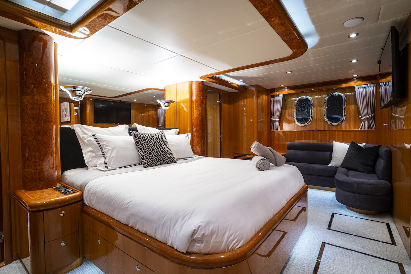 On the main deck, there is a formal dining area and salon where guests can rest in comfort in air-conditioned surroundings while enjoying excellent views of the location through the broad windows on either side.