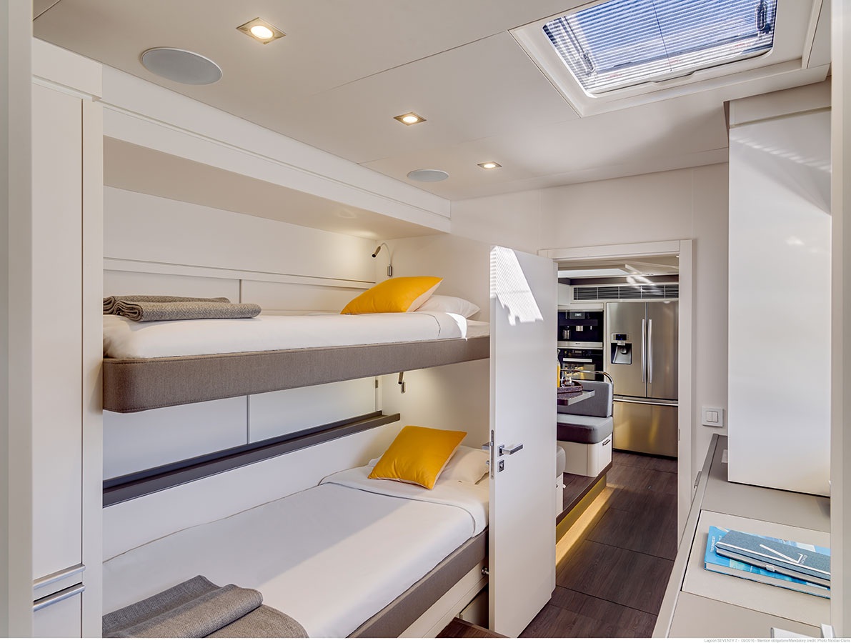The beautiful and modern interiors by Nauta Design accommodate up to 8 guests in 4 cabins, with a crew of 4 on board.