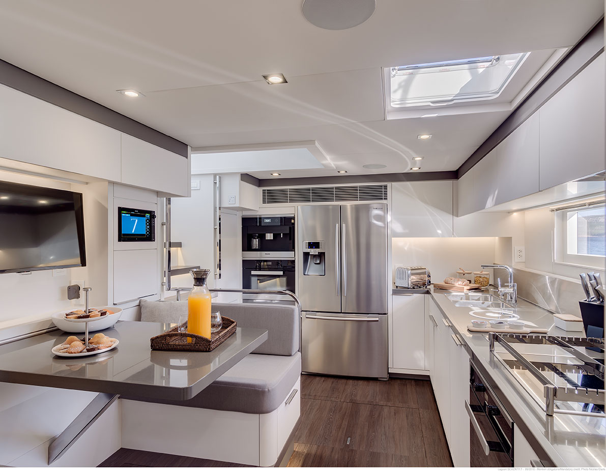 The port and starboard hulls contained the guest and crew accommodation as well as the galley, with the central area dedicated to lounging and dining.