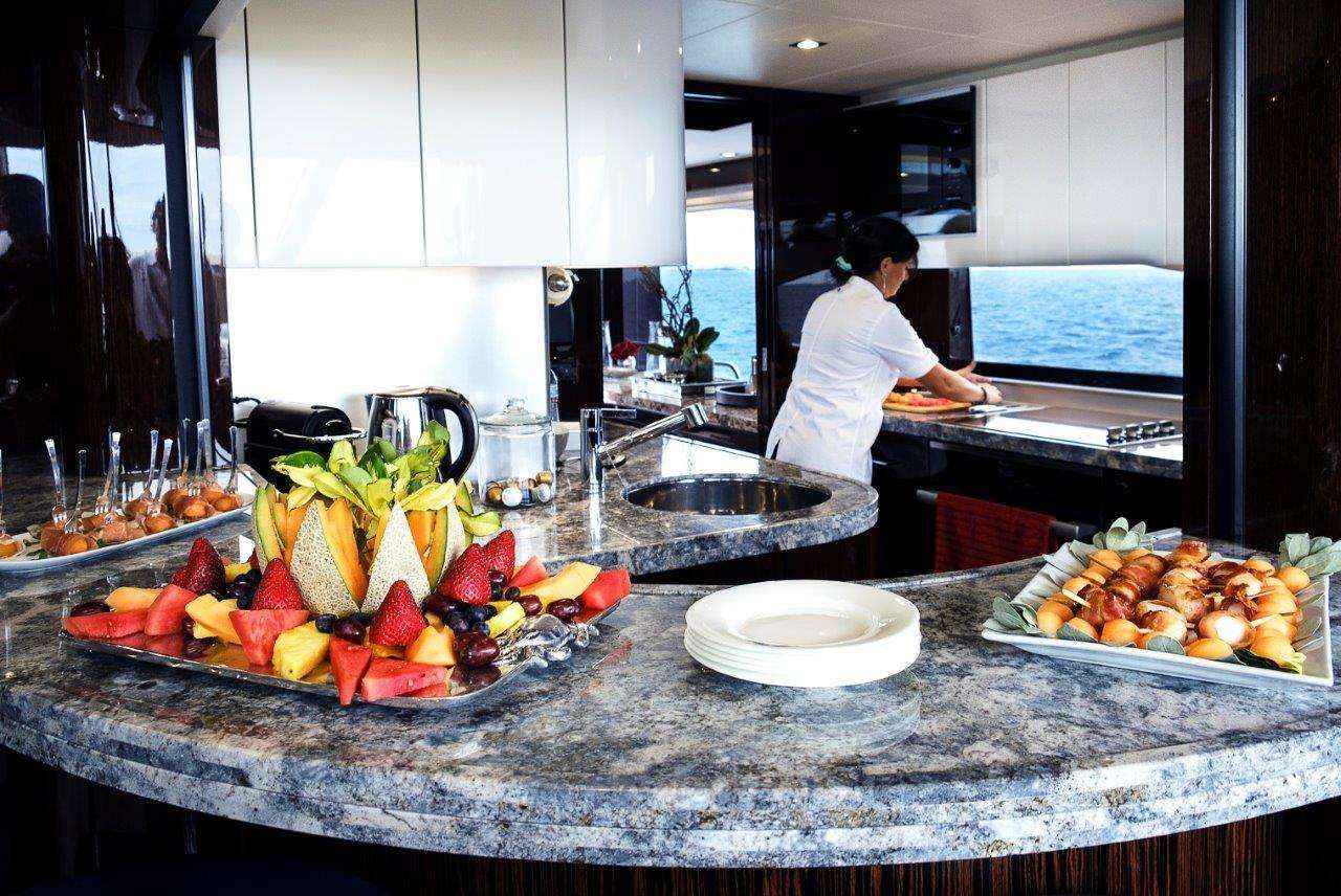 Behind is the galley, followed by the main salon - an open plan environment that receives plenty of natural light from the surrounding large windows, and the formal dining area to seat 10 is placed forward in this space.