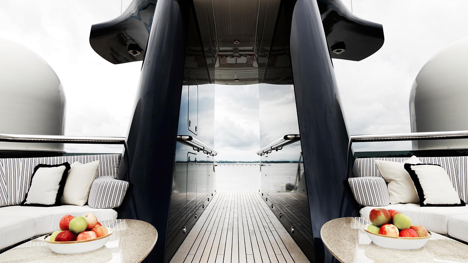 The gym comes with a comprehensive selection of equipment and leads through to the aft beach club, furnished with a bar and three sofas placed around a coffee table. To port is the water toys storage for the jet skis with a ...